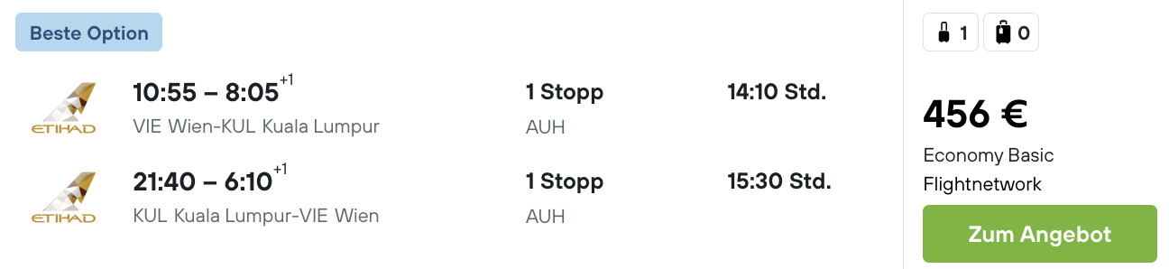 Beispiel von Wien nach Kuala Lumpur z.B. 14.01. - 28.01.2026