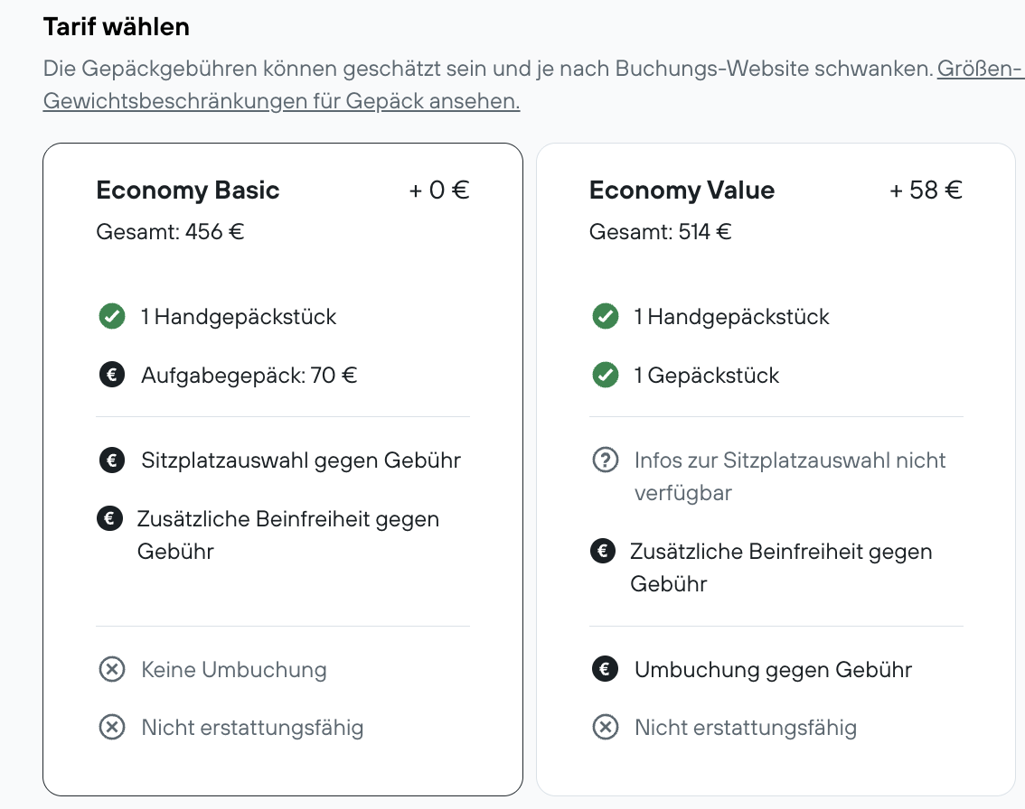 Wenn ihr Aufgabegepäck dazubuchen möchtet, klickt einfach auf euren Wunschflug und wählt dann den "Economy Value" Tarif. (siehe Screenshot)
