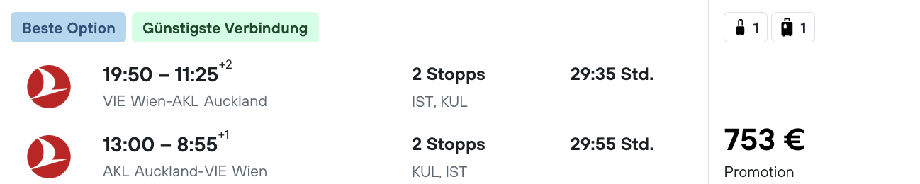 Neuseeland ist für viele ein absolutes Traumziel, aber die Flüge sind leider oft extrem teuer. Hier ist mal eine der seltenen Deals, bei dem ihr auch noch mit Turkish Airlines, der aktuell sechstbesten Airline der Welt (laut Skytrax) fliegt (das letzte Segment wird von deren Partner Malaysia Airlines geflogen).