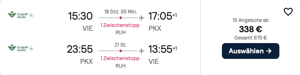 so gute Preise haben wir selten für Flüge nach China gesehen. Ab nur 335 € könnt ihr inklusive Gepäck mit Saudia (Saudi Arabian Airlines) nach Peking fliegen! Doch wartet nicht zu lange, die Preise werden sich vermutlich nicht lange halten ✈️
