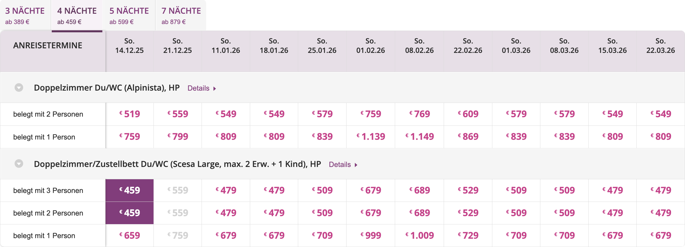 Getrennt gebucht: 4 Nächte für 411 € p.P. + 177 € für 3-Tage-Skipass p.P. = 588 € p.P.