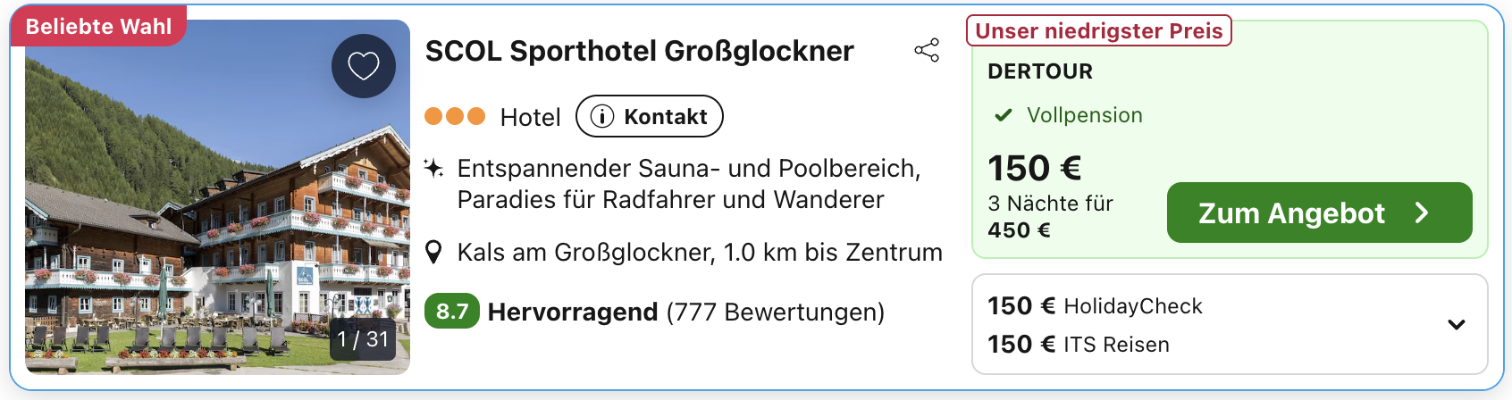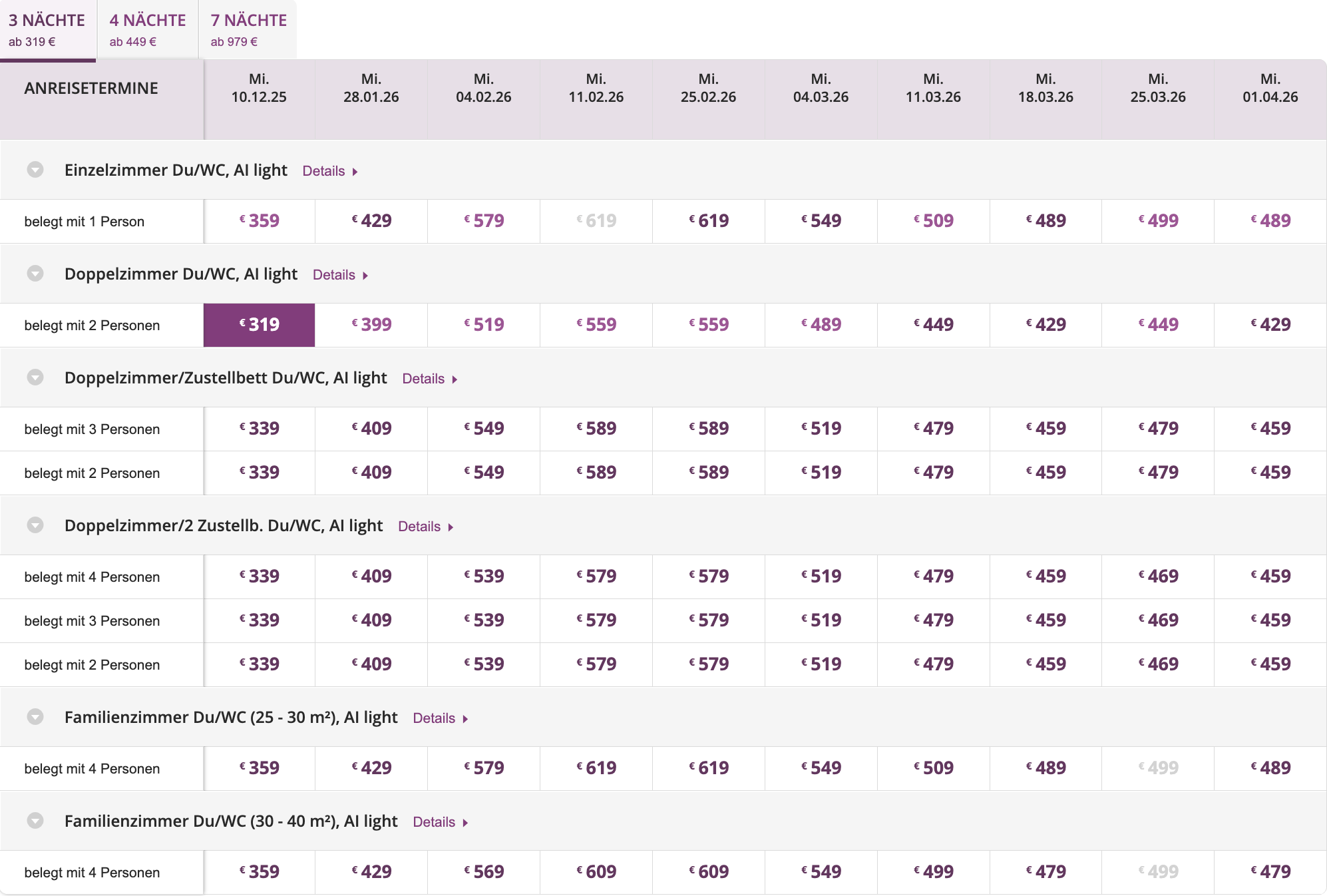 Getrennt gebucht: 3 Nächte für 225 € p.P. + 125 € für 2-Tage-Skipass p.P. = 350 € p.P.