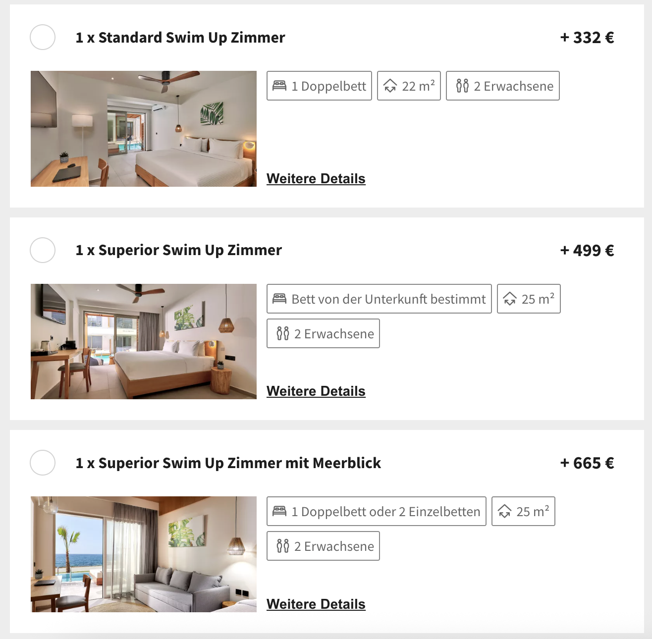 Upgrade gefällig? Nachdem ihr euer Datum ausgewählt habt, könnt ihr ganz easy ein, zwei oder noch mehr Zimmerkategorien upgraden: (Der angezeigte Aufpreis ist nicht pro Person sondern insgesamt)