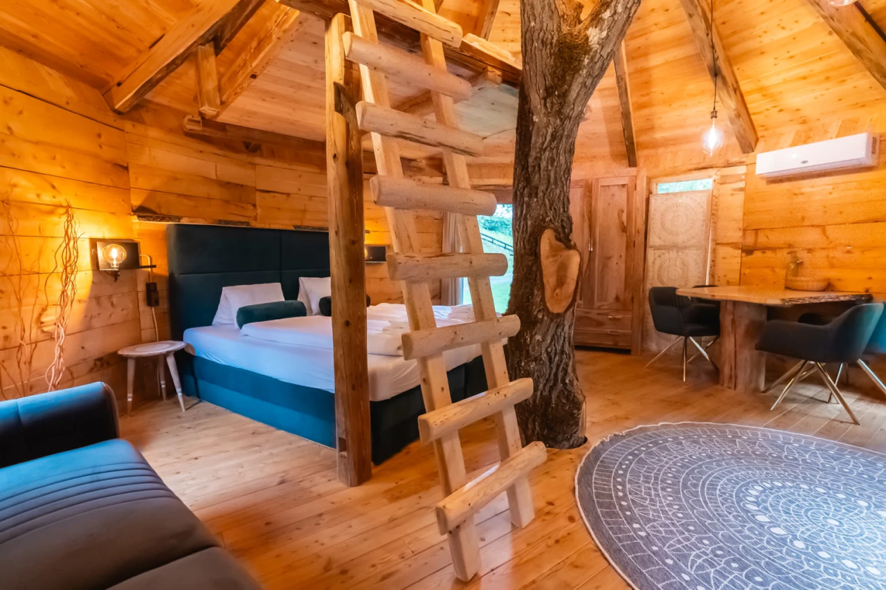Euer Treehouse befindet sich im EuroParcs Wörthersee. Das runde Häuschen verfügt über einen geräumigen Innenraum, der von einem imposanten Baumstamm dominiert wird. Es bietet Platz für ein Doppelbett im Hauptbereich und über eine Treppe gelangt man zu einem weiteren Doppelbett. Zusätzlich gibt es ein gemütliches Sofa, einen Fernseher und einen Esstisch. Eine Kochplatte mit Wasserkocher und Kaffeemaschine ist ebenfalls vorhanden. Die Hütte selbst verfügt über keine sanitären Einrichtungen, jedoch steht den Gästen das Sanitärgebäude des Ferienparks zur Verfügung. Die Terrasse am Wasser bietet eine malerische Aussicht und lädt zum Entspannen ein, während der Garten weitere Möglichkeiten zur Erholung bietet. Parkmöglichkeiten befinden sich auf dem nahegelegenen Parkplatz und WLAN ist ebenfalls verfügbar.