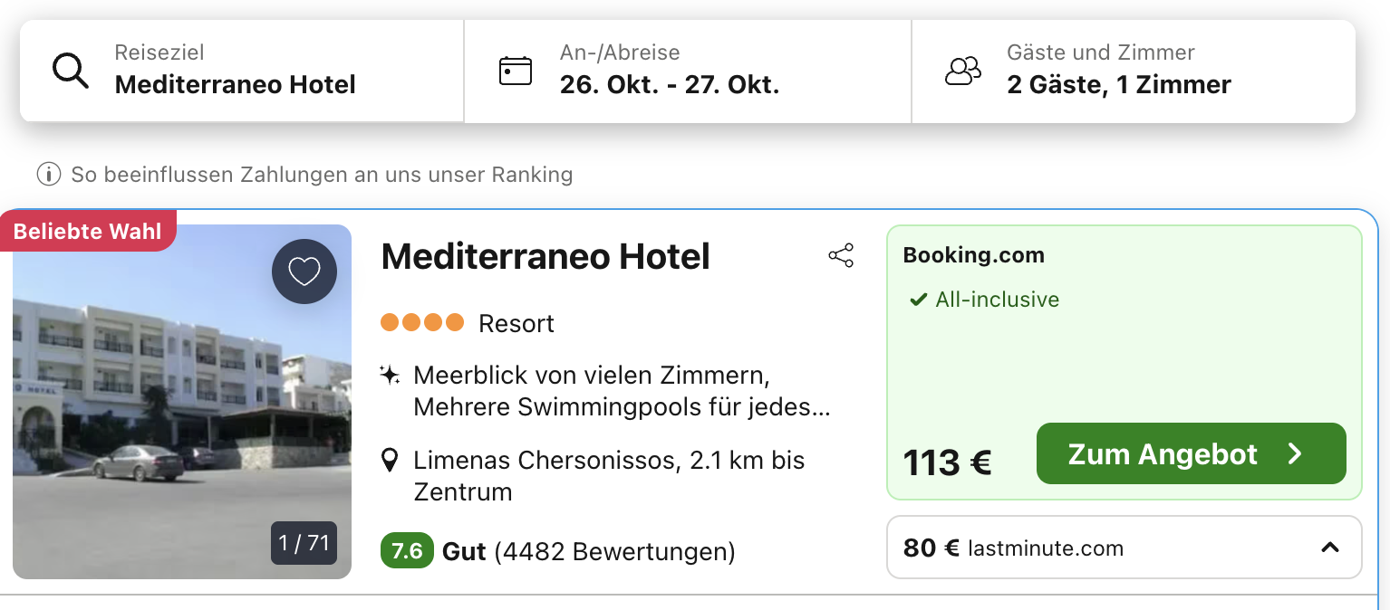 Den Bestpreis findet ihr, wenn ihr auf den kleinen Pfeil rechts klickt und dann das Angebot von lastminute.com auswĂ€hlt. Nach der Weiterleitung sinkt der Preis sogar noch einmal. đ€©