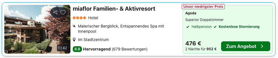 2 Nächte mit Halbpension Plus 🍳 gibt's schon ab 229 € pro Person. Damit spart ihr gegenüber anderen Anbietern fast 100€.