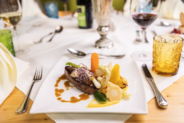 Abendessen: Menüwahl oder variationsreiches Themenkulinarium mit Gerichten aus der biozertifizierten Grüne Haube-Küche – besonders schonend und fettarm zubereitet