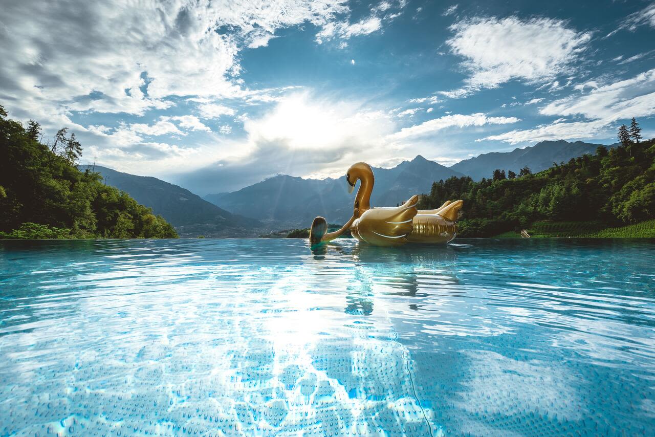 Das Prinz Rudolf begeistert mit einer erstklassigen Lage oberhalb von Meran - top Aussicht inklusive. Die habt ihr unter anderem auch, wenn ihr in dem coolen Infinity-Pool des Hotels abhängt. neben dem findet ihr im Wellnessbereich eine Finnische Sauna, Bio Gold Sauna und Panorama-Ruheraum, auf dem dach des hauses erwarten euch zudem zwei Runde Rooftop-Pools, natürlich mit 360° Panorama.