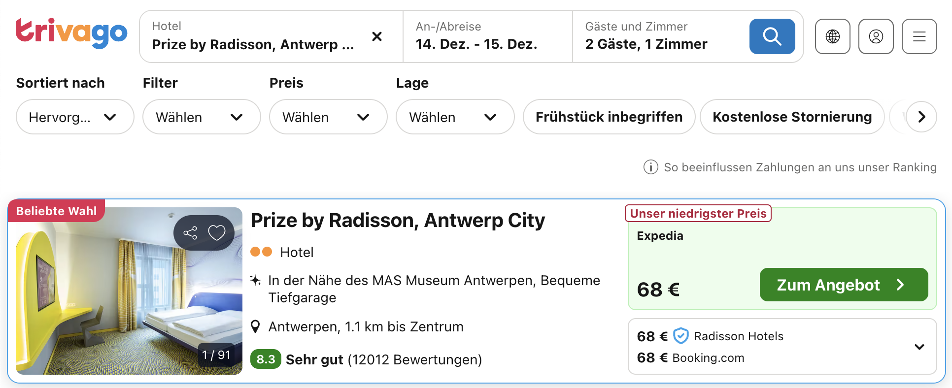 An unsrem Beispieltermin konnten wir den besten Preis direkt auf der Hotelwebsite (Radisson Hotels) finden. Denn dort sinkt der Preis nochmal um 14%, wenn ihr euch schnell kostenlos & unverbindlich mit eurer E-Mail-Adresse anmeldet (Mitglied -14%). Lasst euch also einfach zu Radisson Hotels weiterleiten.
