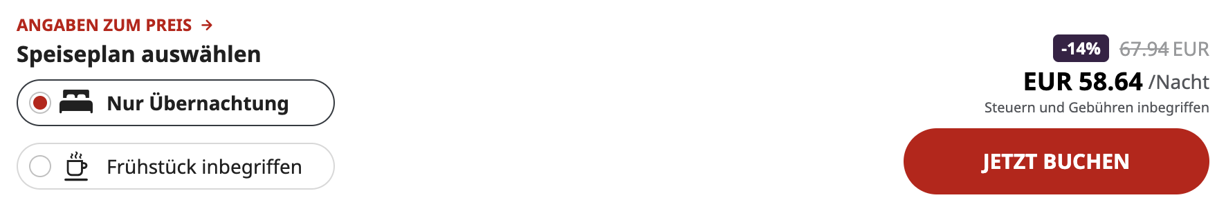 Lasst euch also einfach mal weiterleiten und checkt eure Wunschoption (Frühstück, kostenlose Stornierung, etc.) aus. Natürlich könnt ihr auch länger bleiben, wenn ihr wollt.