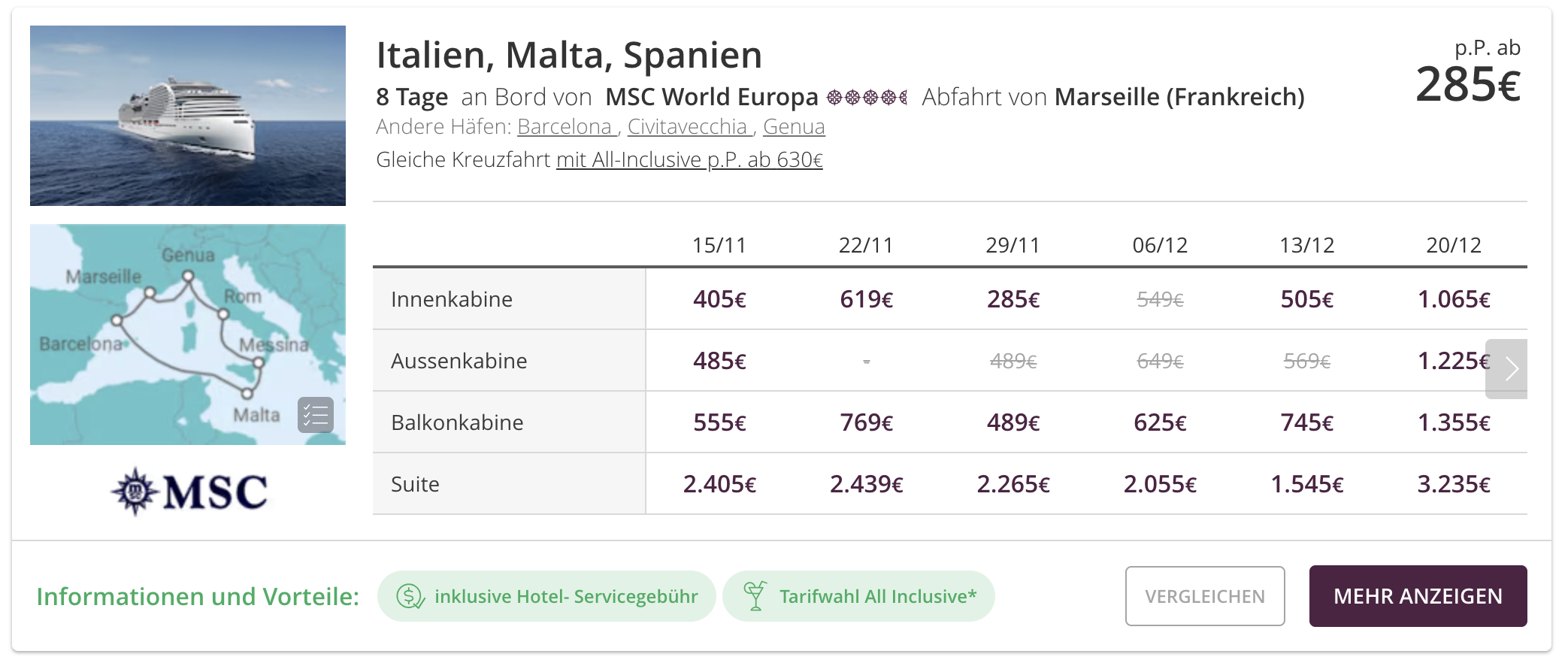 Preisrutsch: Diese Kreuzfahrt hat im letzten Jahr noch durchschnittlich 700 Euro pro Person gekostet und in den letzten Wochen immerhin noch 609-639 € – jetzt ist der Preis einfach mal kurzfristig auf 319 Euro pro Person runter gerauscht! 🤯 UPDATE: Jetzt sogar auf 285 Euro gefallen, absolut crazy!