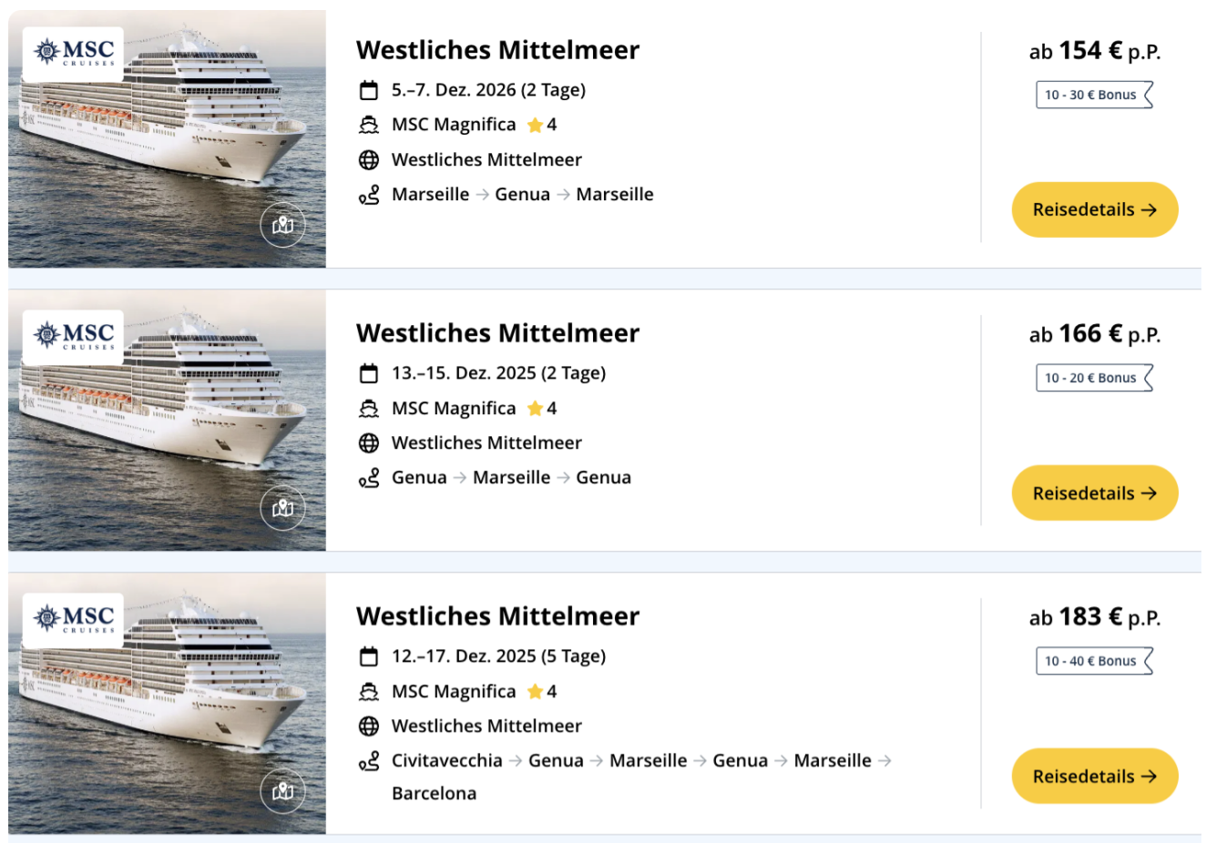 Los geht's bereits ab 154 ⏠fĂŒr Kurzreisen im Mittelmeer oder im Norden. FĂŒr unter 200 ⏠bekommt ihr aber auch schon eine 5-tĂ€gige Cruise im Mittelmeer! Es sind auch 7-tĂ€gige Cruises im Mittelmeer und zu den Kanaren im Sale! Hier starten die Preise bei unter 400 âŹ! Unten findet ihr eine Auswahl!