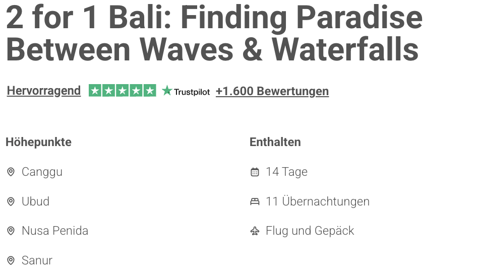 Dann ist das DEIN Zeichen, um diesen Trip zu buchen und deinem Freund, deiner Freundin, Mama, Papa, oder welcher Reisebegleitung auch immer, die GRÖßTE FREUDE zu machen, denn aktuell schickt euch journaway für 14 Tage (11 Nächte vor Ort) nach Bali und das ab NUR 1.999€ für euch beide!!! 🔥😱