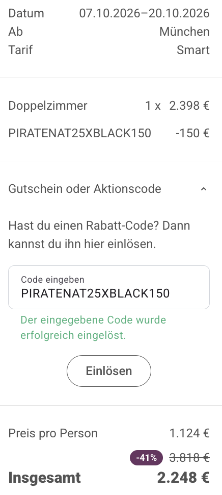 Gutscheincode ist kombinierbar mit bereits reduzierten Reisen