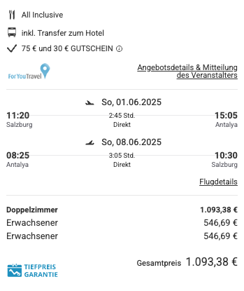 🧑🧑🧒🧒 Das Angebot eignet sich perfekt für euren Familienurlaub. Nach der Weiterleitung passt ihr einfach den Reisezeitraum, die Anzahl der Personen und das Alter eures Kindes an.