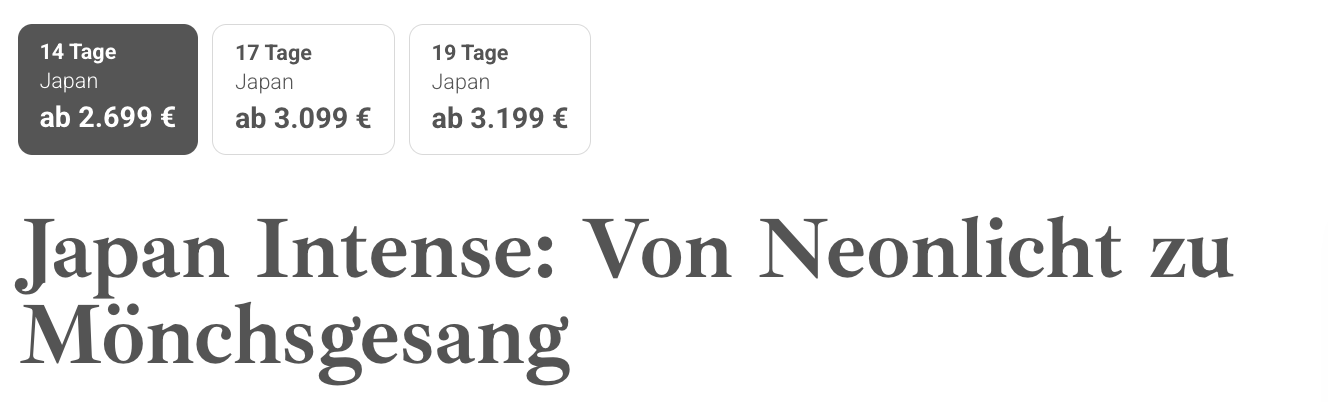 Vergangenen Monat haben wir uns die Preise für dieses Produkt genauer angesehen. Im Oktober konnte man die Reise ab einem Preis von 2.699€ p.P. buchen. Im Zuge der Black Week-Aktion wurde diese Reise auf 1.999€ p.P. reduziert und on Top gibt es noch 150€ Rabatt auf jede Buchung. Ihr spart also in diesem Direktvergleich 775€ pro Person, wenn ihr zu zweit reist.