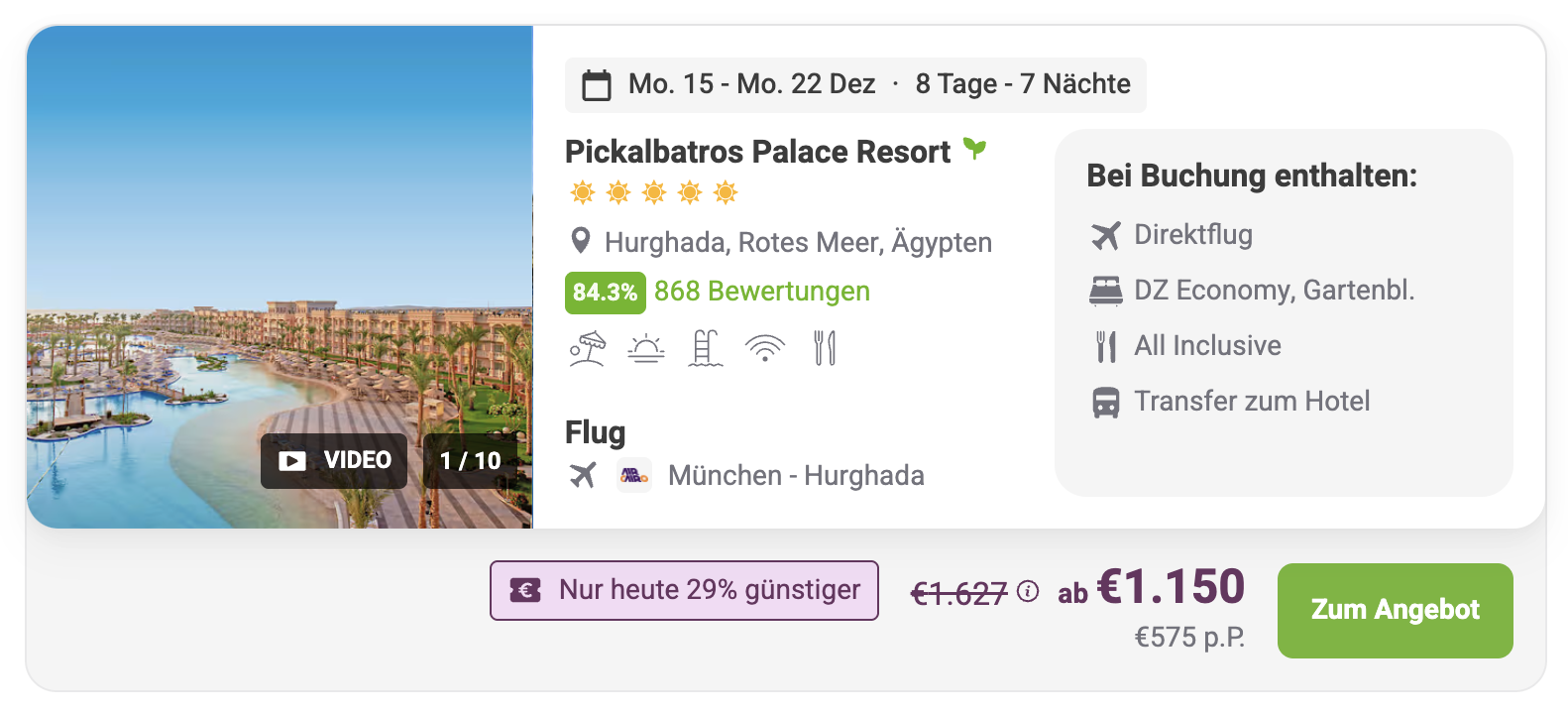 Ăber 90% Weiterempfehlung, direkt am Strand & ein All Inclusive Programm, was keine WĂŒnsche offen lĂ€sst und das ab unter 600 Euro pro Person - inklusive 7 Ăbernachtungen im 5* Pickalbatros Palace Resort, DirektflĂŒgen mit GepĂ€ck & Transfer. đ„