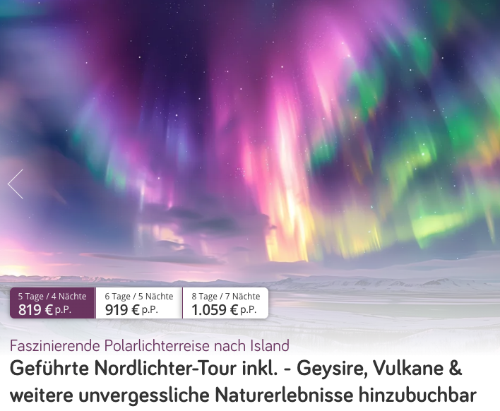 ✈️ Dieser Deal bringt euch für 5 Tage (optional auch für 6 oder 8 Tage) nach Island; inkl. Flügen, einem Hotel mit Frühstück, Flughafentransfer, einer abendlichen Polarlichter-Tour zahlt ihr dank unseres exklusiven Gutscheincodes nur 789 Euro pro Person.