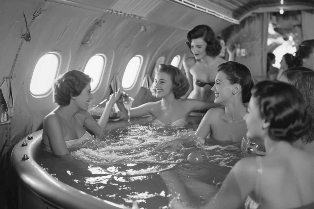 Dies war jedoch noch nicht das Ende der Extravaganz ... Für diejenigen, die ein entspannteres Erlebnis suchten, boten einige Fluggesellschaften Whirlpools an Bord an, in denen man während des Fluges baden konnte. Angesichts dieser Pracht blieben Sicherheitsprotokolle im Hintergrund. Oder sogar oft außerhalb des Flugzeugs...