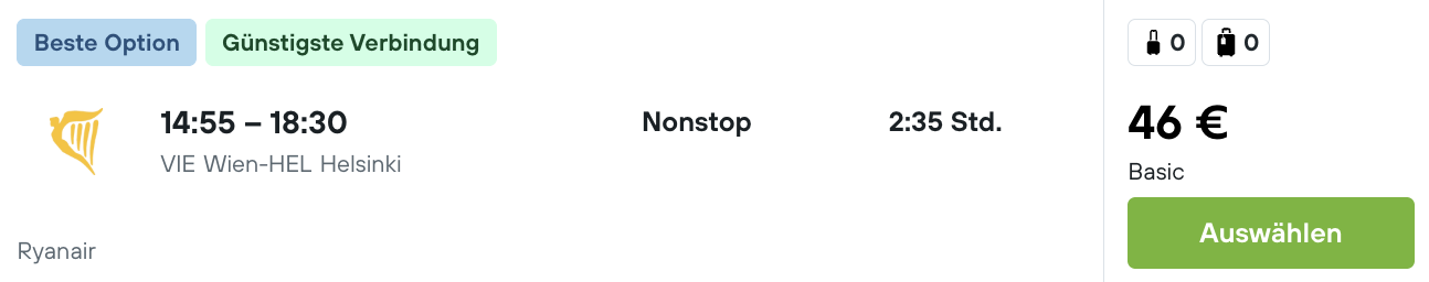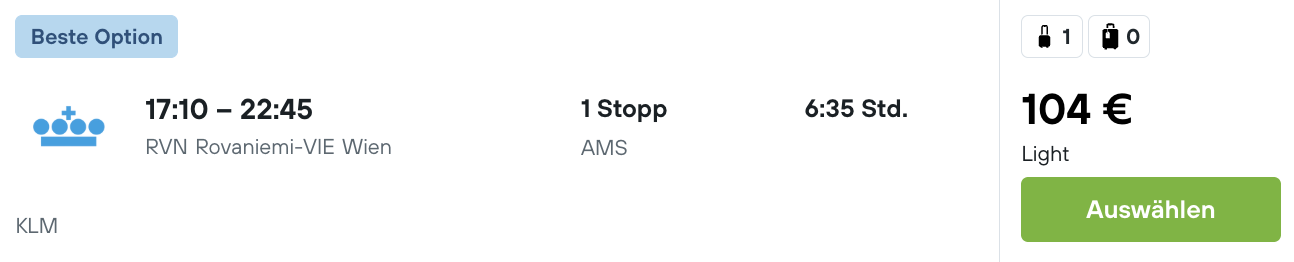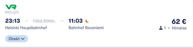Gebt einfach als Abfahrt Helsinki und als Ziel Rovaniemi an und wählt das passende Datum aus. Generell gibt es ziemlich viele Verbindungen, einige auch ohne Umstieg, wie unser Beispiel.